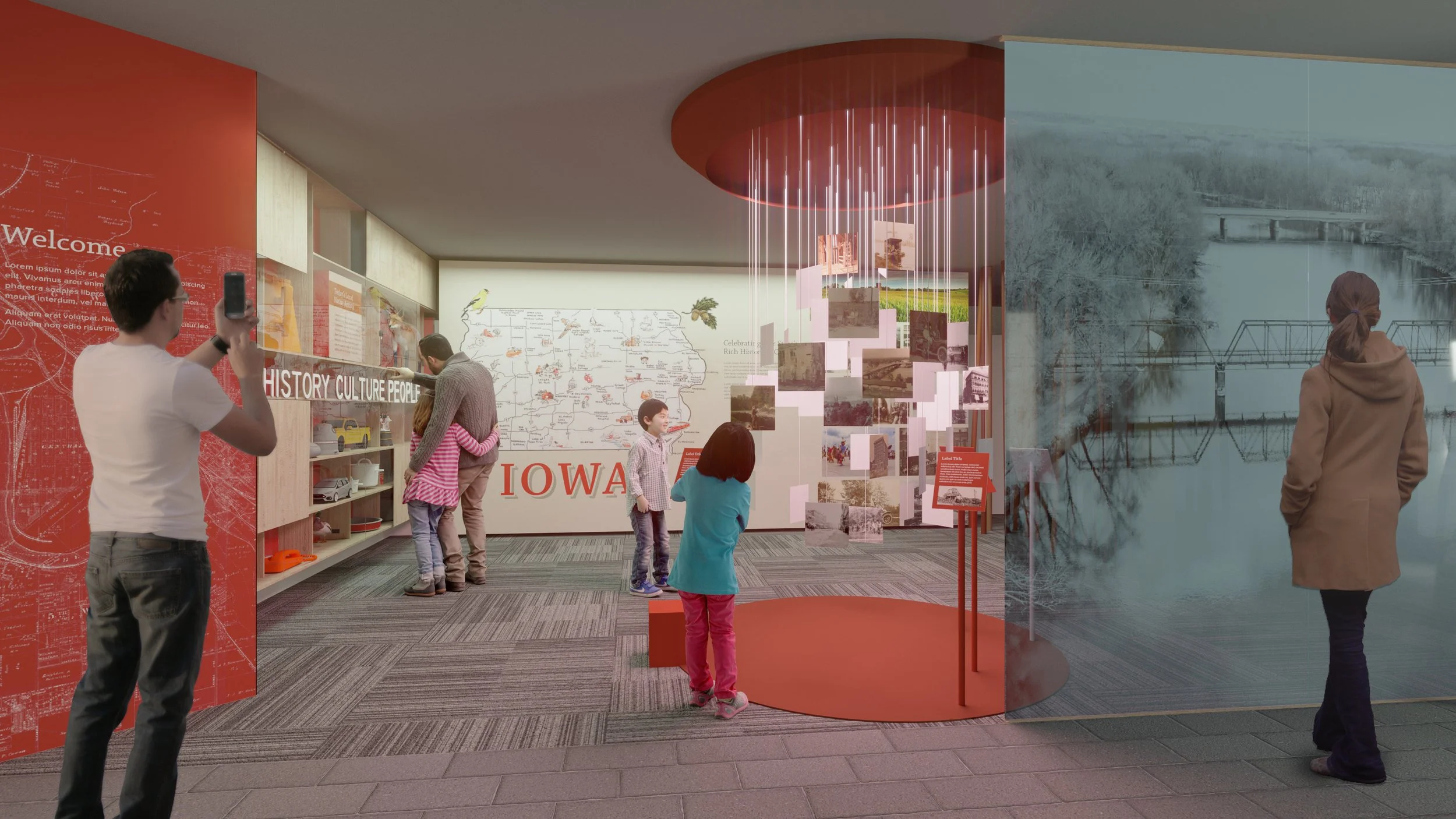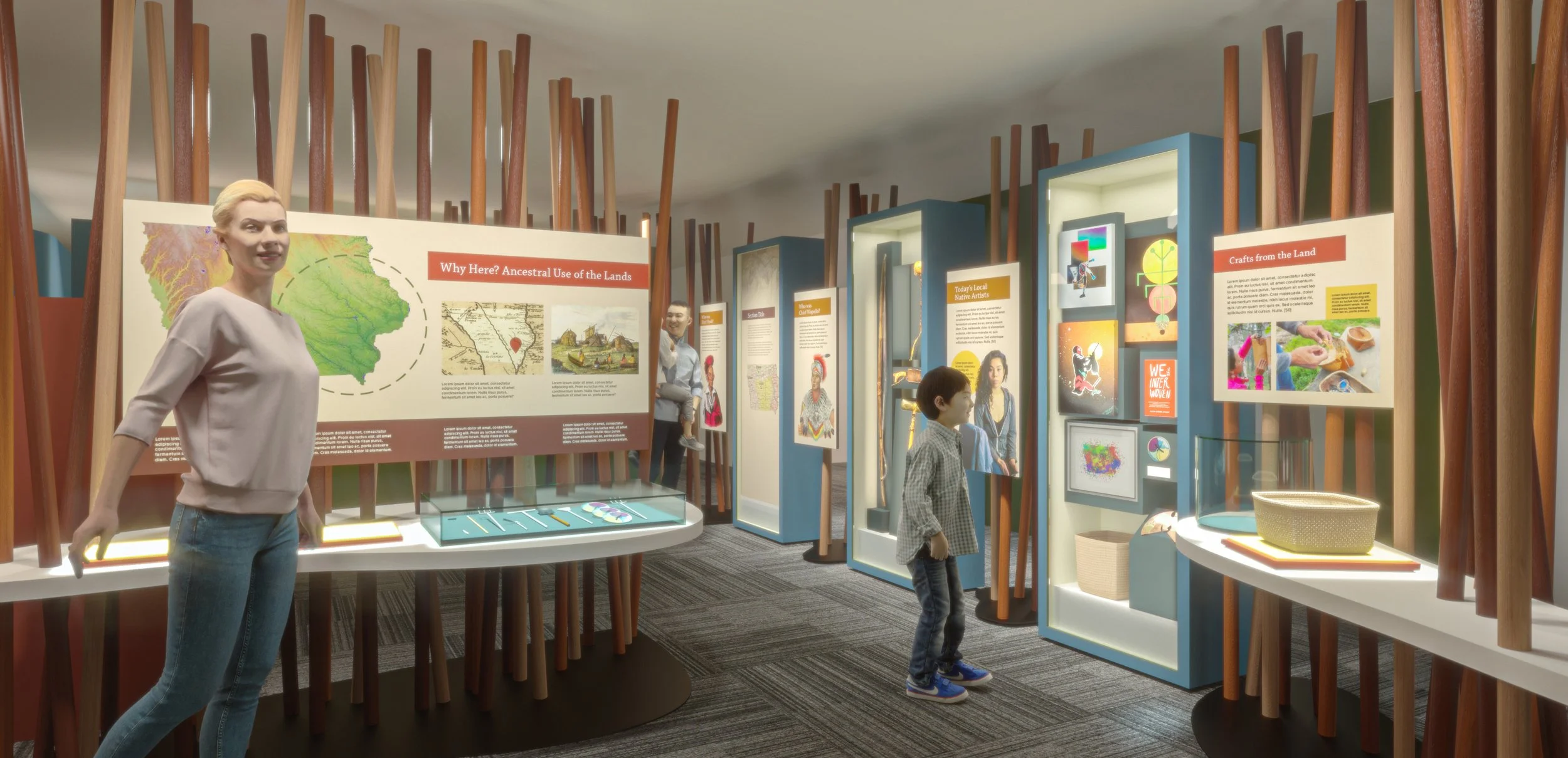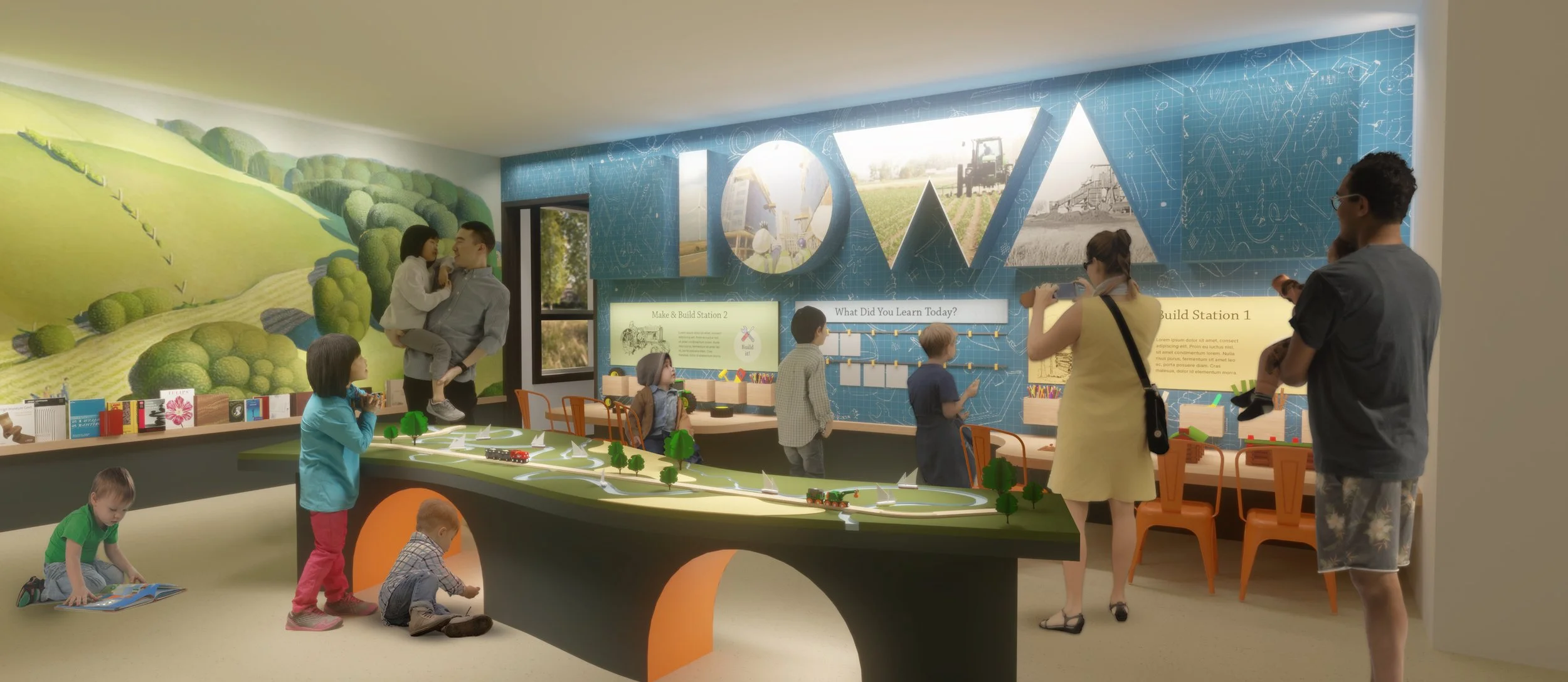 The guiding aesthetic for this gallery is the idea of “the man-made meets the natural.” This concept reflects Iowa’s identity with cities shaped around rivers such as the Des Moines, industries adjacent to farmland, and the presence of natural and semi-natural (agricultural) environments in daily life. In contrast to the existing architecture, exhibit elements that subdivide the space are free-flowing and intended to evoke natural forms, such as meandering rivers, rolling hills, and wooded trails.