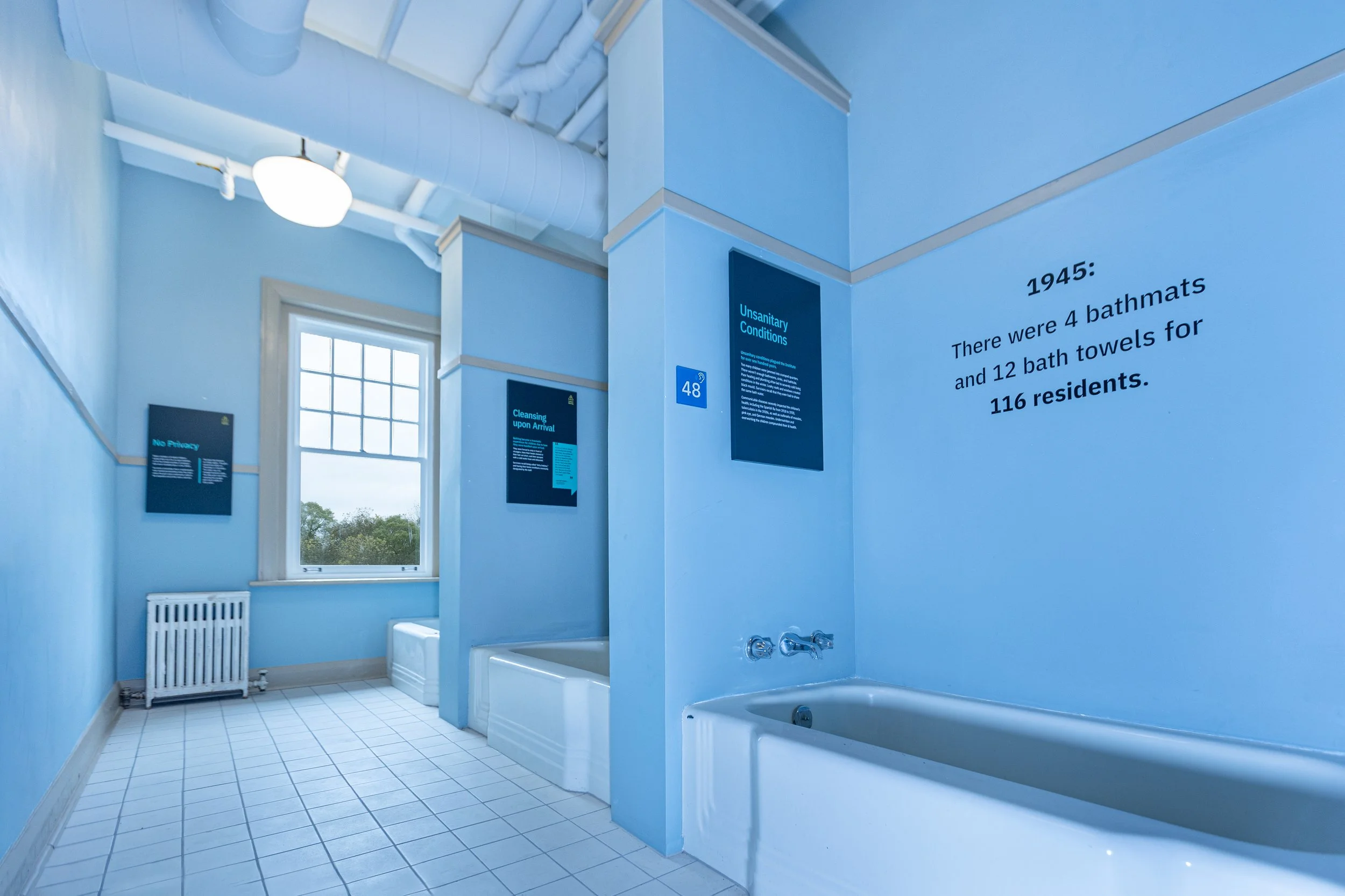 The building itself is an artifact, holding the memories and stories of those who spent time there. Our approach was to apply the exhibits with a light touch, allowing the space itself to express these memories. Graphic panels “float” off the walls, lighting reveals evidence of the past, and subtle interventions, such as silhouetted scrims and stencilled quotes, evoke the presence of the children who lived, studied and worked there. To ensure that this continues to be an active site of conscience, flexibility was built into the system through standardized panel sizes and mounting methods, allowing new stories and content to be added over time. Listening stations and immersive media deepen engagement with Survivor testimony; multimedia development was led by our partners at Thru The RedDoor and NGX.